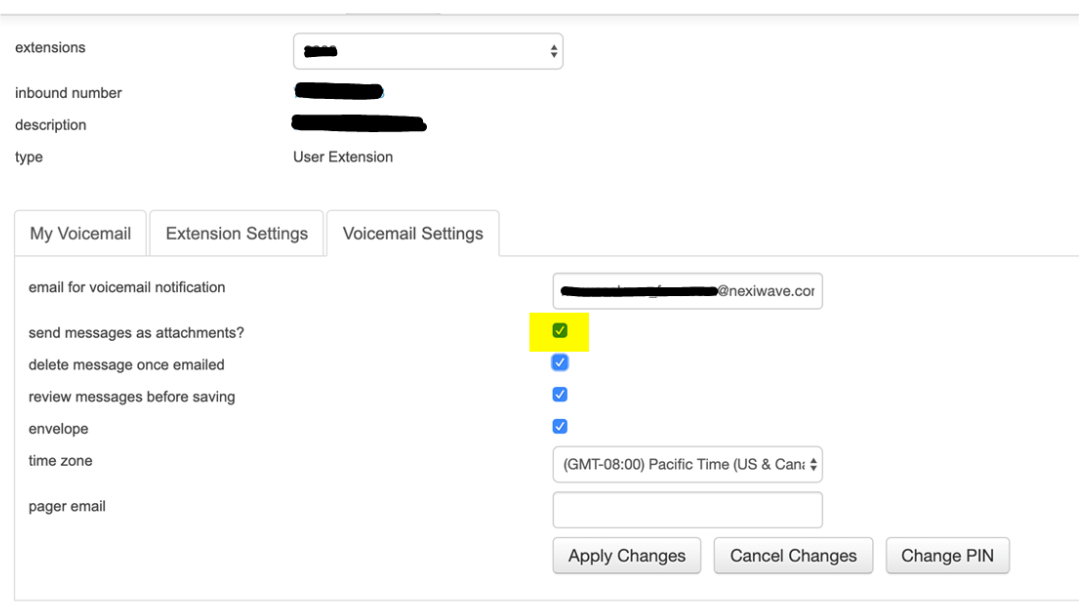 - In the “Voicemail Settings” Tab for Home section, check “send messages as attachments” and add your Nexiwave Voicemail Transcription email address obtained above to the “email for voicemail notification”, then Apply Changes.